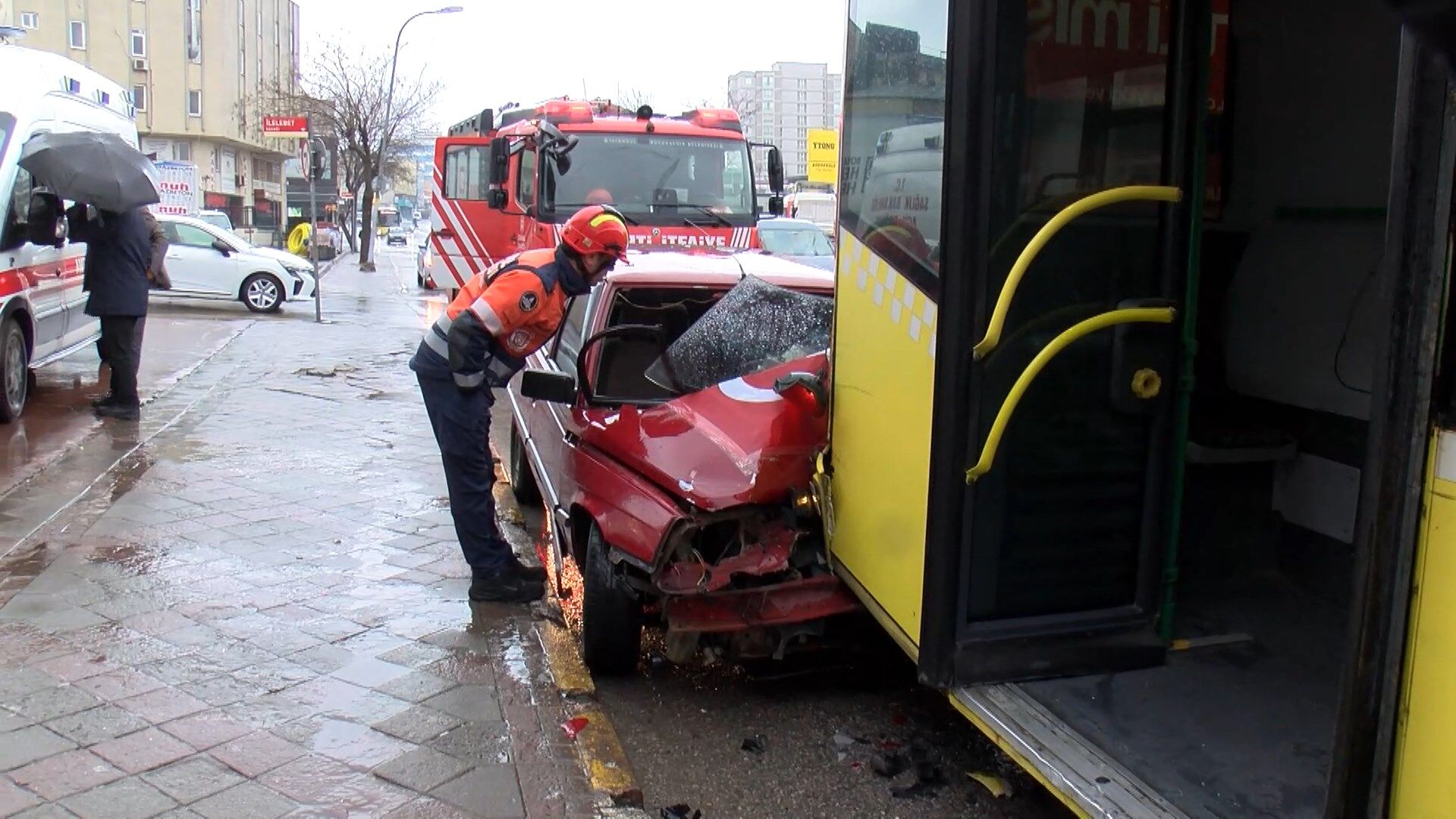 Ümraniye’de yağışlı havanın etkisiyle kayganlaşan yolda sürücüsünün direksiyon hakimiyetini kaybettiği otomobil, durakta yolcu almak için bekleyen İETT otobüsüne çarptı. Kazada yaralanan otomobil sürücüsü ambulansla hastaneye kaldırıldı.